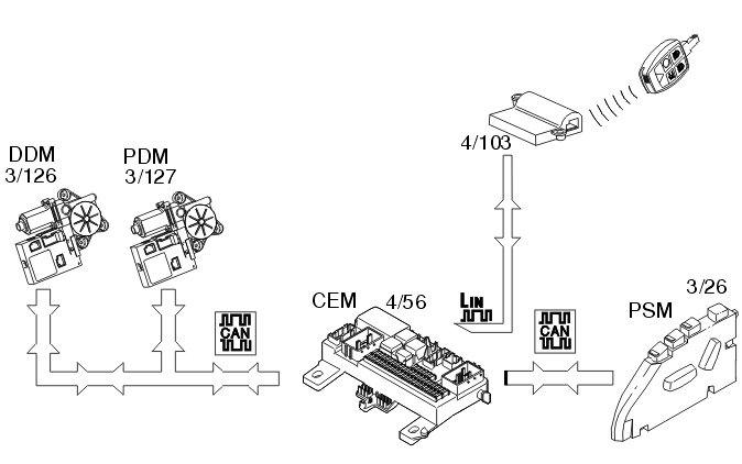 The signal from the remote control is transmitted to the central electronic module (CEM) (4/56) when the car is locked or unlocked. The central electronic module (CEM) also identifies which remote control is being used, stores this information and decides what information must be sent to:
