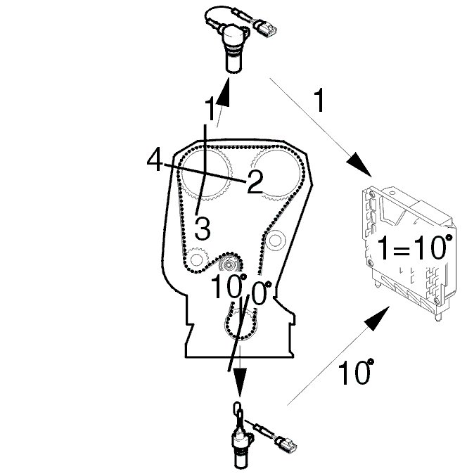 The reference positions of the crankshaft coincide exactly with each camshaft flank if the camshaft cam timing is 0°. If the cam timing deviates from 0°, i.e. the flanks deviate from the reference positions of the crankshaft, the control module calculates the number of crankshaft degrees by which the flank is deviating.