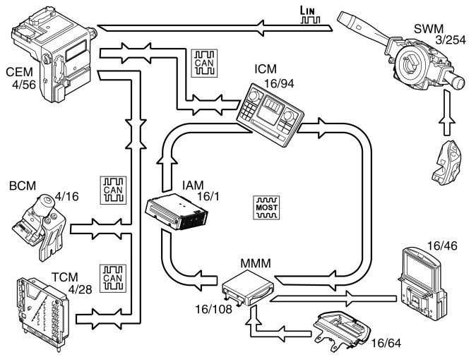 The commands are transmitted from the Steering wheel module (SWM) (3/254) via LIN to the Central electronic module (CEM) and on to the Infotainment control module (ICM) (16/94) on the CAN network. The Steering wheel module (SWM) converts the electrical signal to an optical signal and sends it onwards to the multimedia module (MMM) (16/108) via the MOST network.
