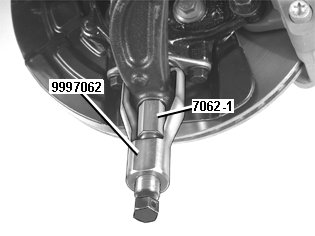Pull down the link arm. Use: 999 7076 Lever 999 7076 Lever and move the wheel spindle to the side, and install the protective sleeve: 999 5562 PROTECTIVE SOCKET 999 5562 Protective Socket on the ball joint pin at the same time. Keep it in position using the ball joint nut.