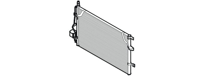 The compressor pumps in hot refrigerant gas under high pressure. The gas has a temperature of between 70 and 110 °C in the intake on top of the condenser. When the hot gas flows through the pipe loop, it is cooled down and condensed. The heat that is removed from the gas during this process is transferred to the surrounding air. The engine cooling fan (FC), which is the same fan used by the engine cooling system, increases the airflow through the condenser. The air flow increases the transfer of heat from the refrigerant to the outside air.