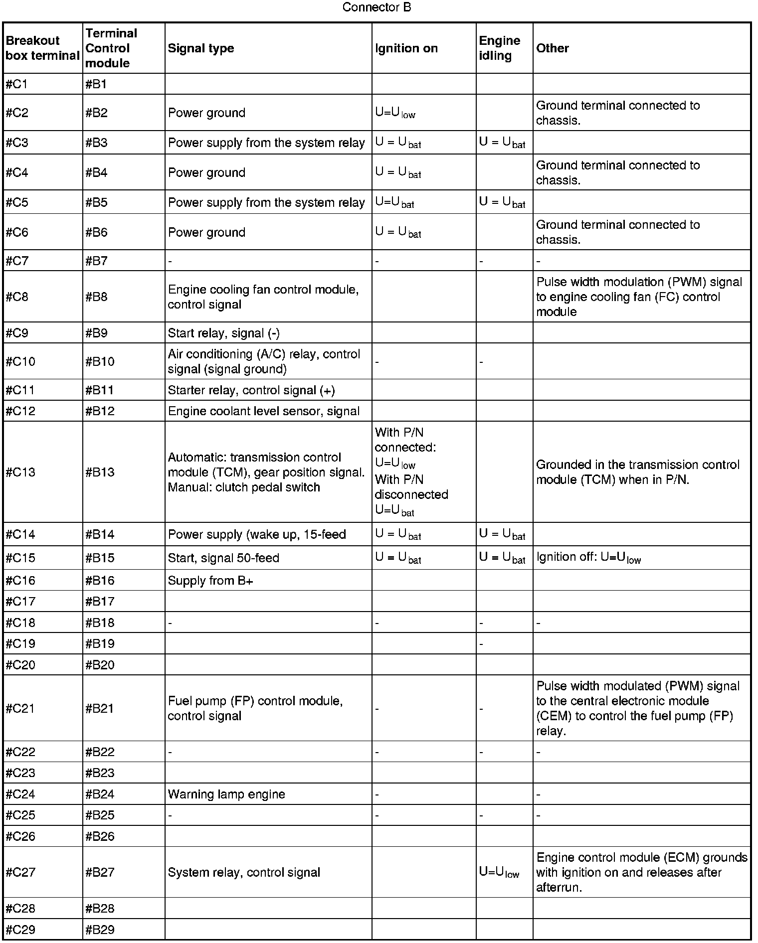 Connector B (58-pin engine side) corresponds to terminals #C1 - #58 on the breakout box.