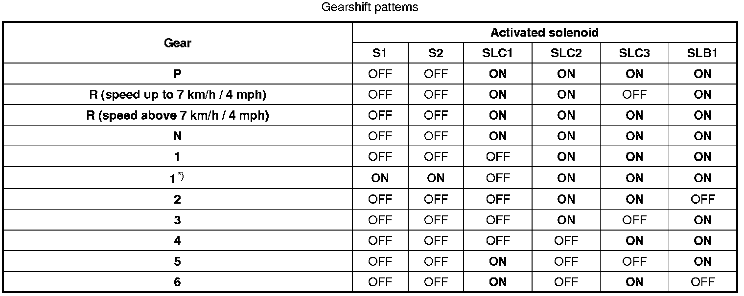 Shifting is regulated by the transmission control module (TCM) activating the solenoids in a specific pattern. The solenoids S1, S2, SLC1, SLC2, SLC3 and SLB1 control which gear is engaged. The solenoids SLC1, SLC2, SLC3 (together with solenoid SLT) also control how engagement occurs by adapting hydraulic pressure. The basic parameters for the various shift points are accelerator pedal position and vehicle speed while shift quality is determined by torque control.