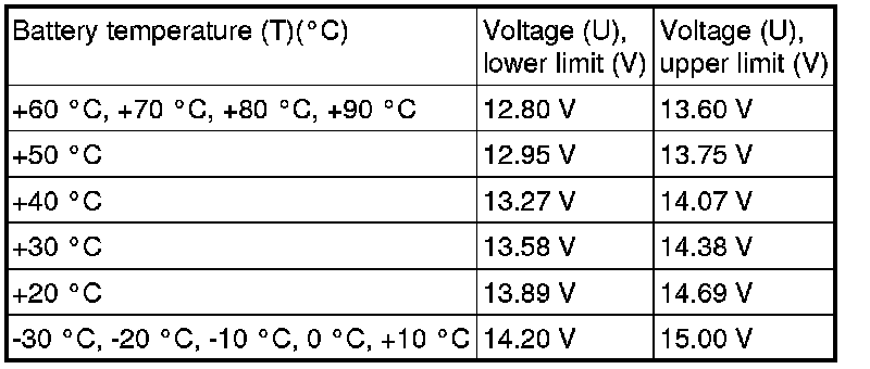 Values for battery temperature and voltage are read and displayed continually during the test. A number of tests are performed in which various battery temperatures are used from -30° C to +90° C. Between each battery temperature, there is a delay of approx. 5 seconds before the voltage is read. This allows the alternator to have time to set the right voltage in relation to the set battery temperature.