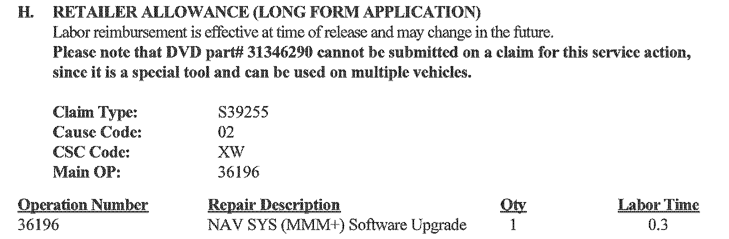 Please note that DVD part# 31346290 cannot be submitted on a claim for this service action, since it is a special tool and can be used on multiple vehicles.
