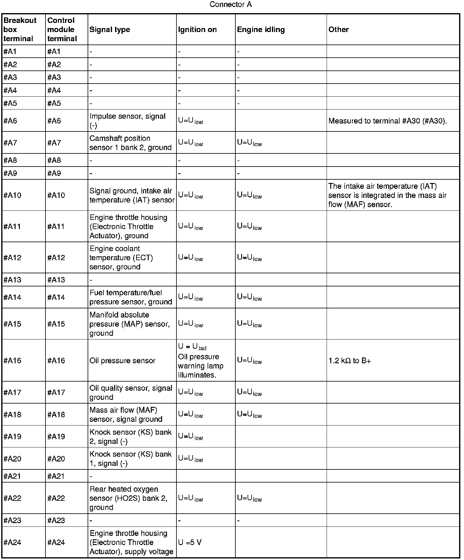 All values indicated below are between respective connection in column 1 and #A C2 on the breakout box. If this is not the case, it is indicated within brackets.