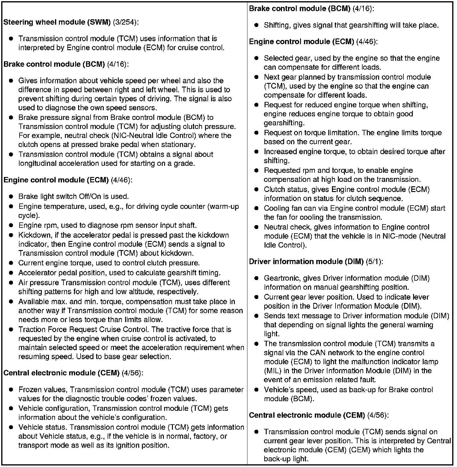 The table below summarizes the input and output signals to and from the transmission control module (TCM). The signal types are divided into directly connected signals, serial communication and CAN communication. The illustration below displays the same information with Volvo component designations.