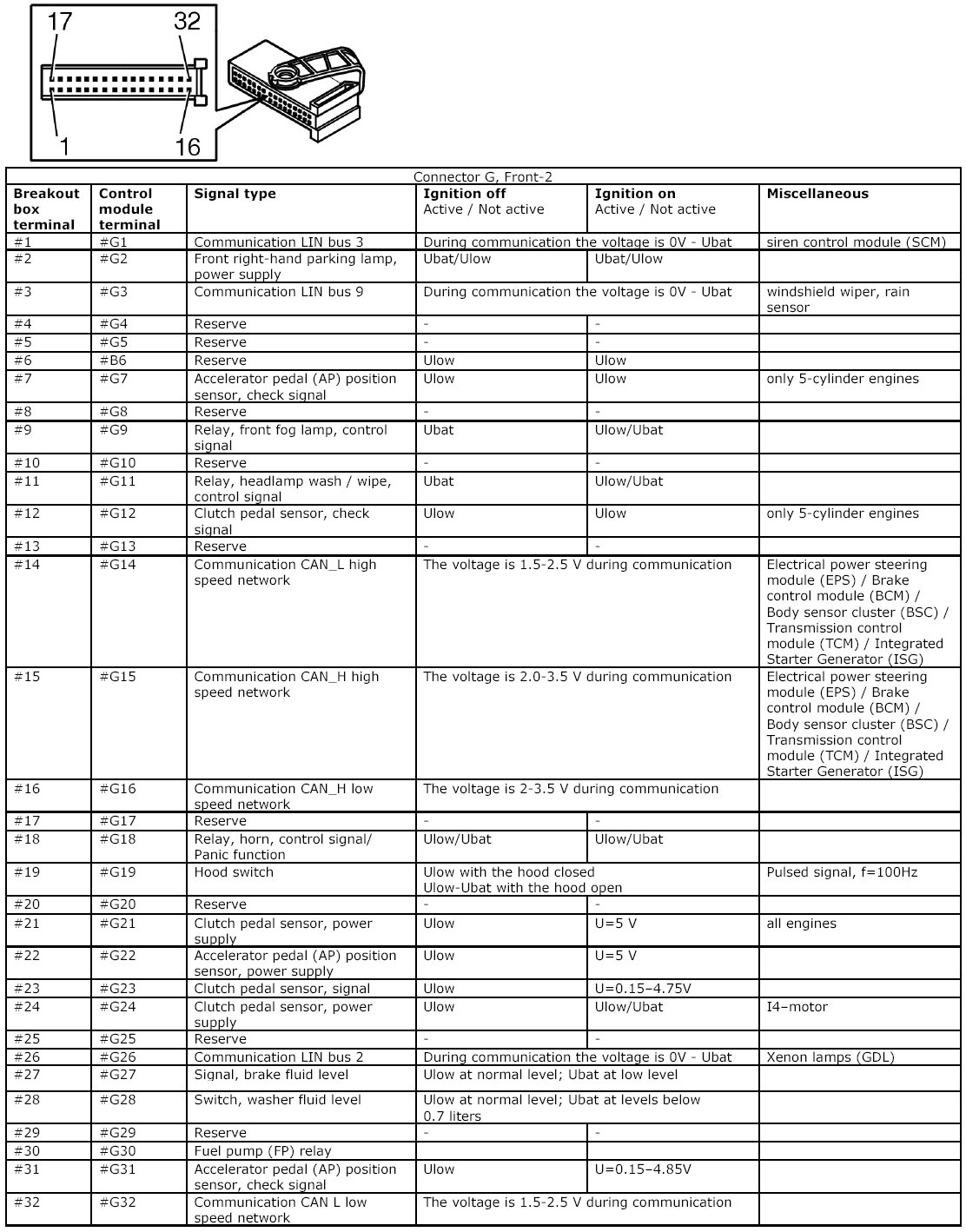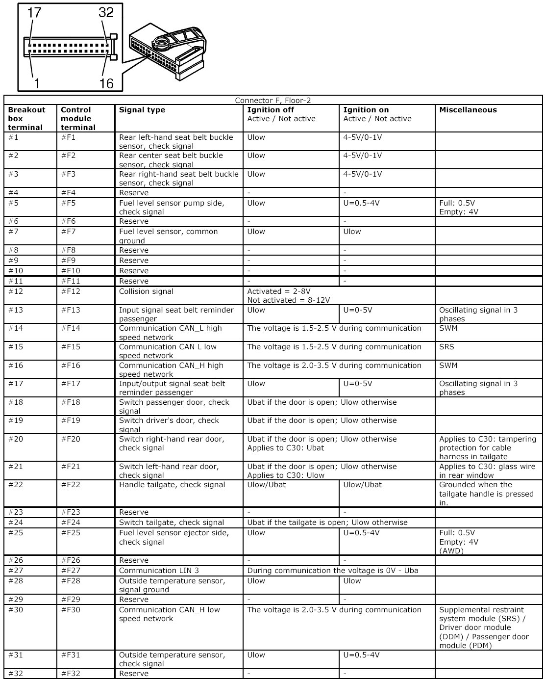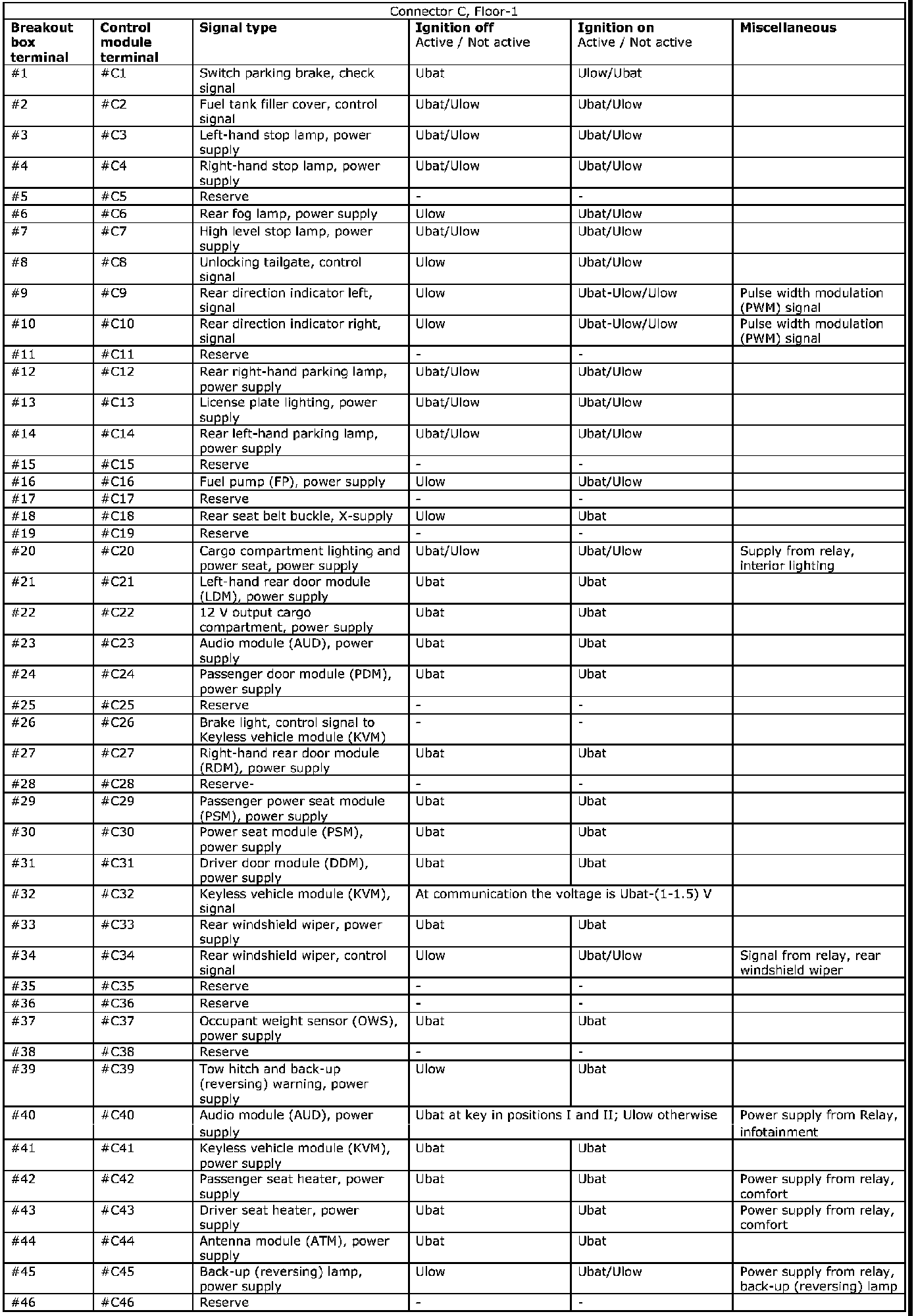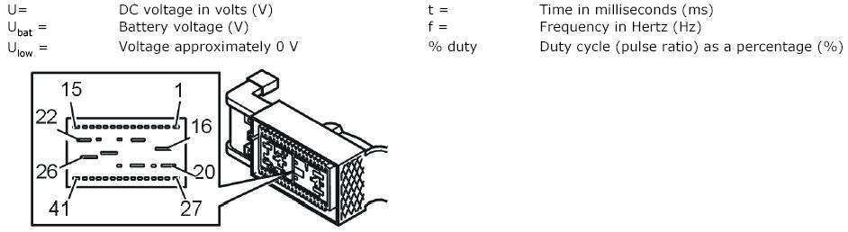 All the values given below are between the connections in column 1 and connection #A28 in column 2 (power ground). This applies unless otherwise indicated in the last column.
