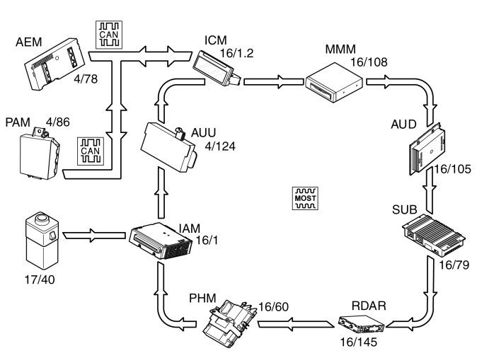 The integrated audio module (IAM) functions as a stereo system in the vehicle and is connected to other control modules on the MOST network.