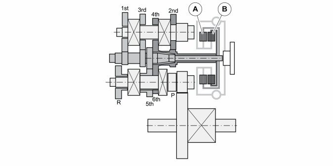 A major difference from conventional automatic transmissions is that Powershift does not have converter/torque converter. There are two gearshifting shafts, one input shaft for uneven gears and an input shaft for even gears. Each gear shaft has a clutch, see figure below.