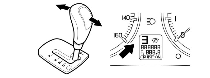 If the gear selector is moved down (-) a signal is sent to Transmission control module (TCM) to downshift. The Driver information module (DIM), when gear selector is in manual shifting mode, switch symbol in the Driver information module (DIM) from D to current gear position, e.g., 3. A signal is also sent to Gear selector module (GSM) to light both LEDs for + and -, to and turn off the other LEDs.