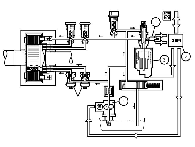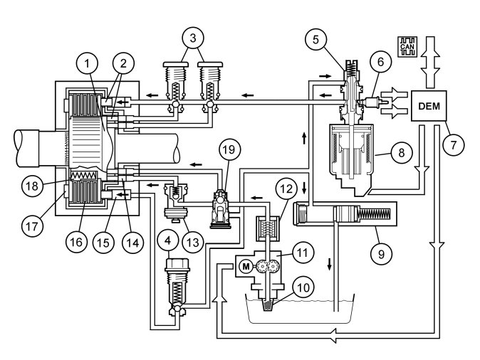 The basic pressure is generated by the electronic feed pump. This pressurizes the annular pistons with oil so that they are pressed against the cam disc via rollers. The annular piston generates a working pressure which is led to the operating piston via the pressure valve. This pressure creates a fixed connection between the input and output shafts. The maximum pressure is limited by the pressure limiting valve. The difference in speed between the input and output shafts is in proportion to the oil pressure fed to the annular pistons. A large difference between the input and output shafts results in high oil pressure to the annular pistons. If the input and output shafts are at the same speed, the oil pressure to the annular pistons is less. The oil pressure at the multi-plate clutch is regulated by the control valve. The axial solenoid controls the control valve. A closed control valve gives maximum pressure to the multi-plate clutch, resulting in maximum power gearbox. An open control valve gives minimum pressure to the multi-plate clutch, resulting in limited power gearbox.