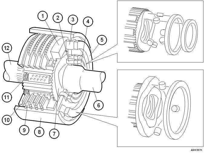 The sinusoidal cam disc rotates at the same speed as the propeller shaft. The annular piston rollers act on the cam disc to press the annular piston in and out. This creates an oil pressure which affects the operating piston, which in term engages the multi-plate clutch unit.