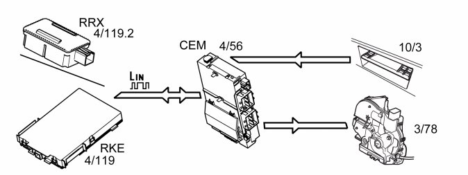 Note! The market in Japan has Remote Keyless Entry (RKE) regardless of if the vehicle is equipped with keyless entry system or not. When the vehicle is not equipped with keyless entry system, the Remote Keyless Entry (RKE) communicates directly with Central electronic module (CEM).