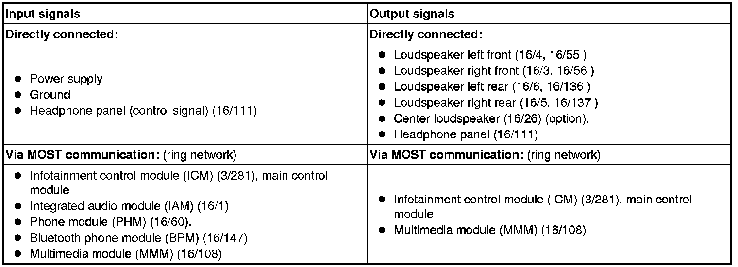 The table below summarizes the input signals to and output signals from the audio module (AUD). The signal types are divided into directly connected signals and MOST communication. The illustration below displays the same information with the Volvo component designations.