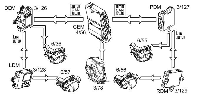 On vehicles with an automatic transmission, the gear selector position is obtained from the Transmission control module (TCM). The gear selector must not be in P or N in order for automatic locking to work.