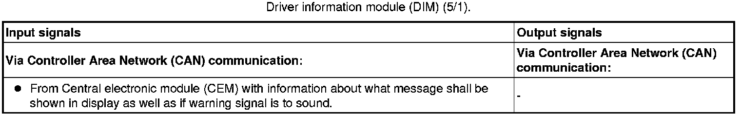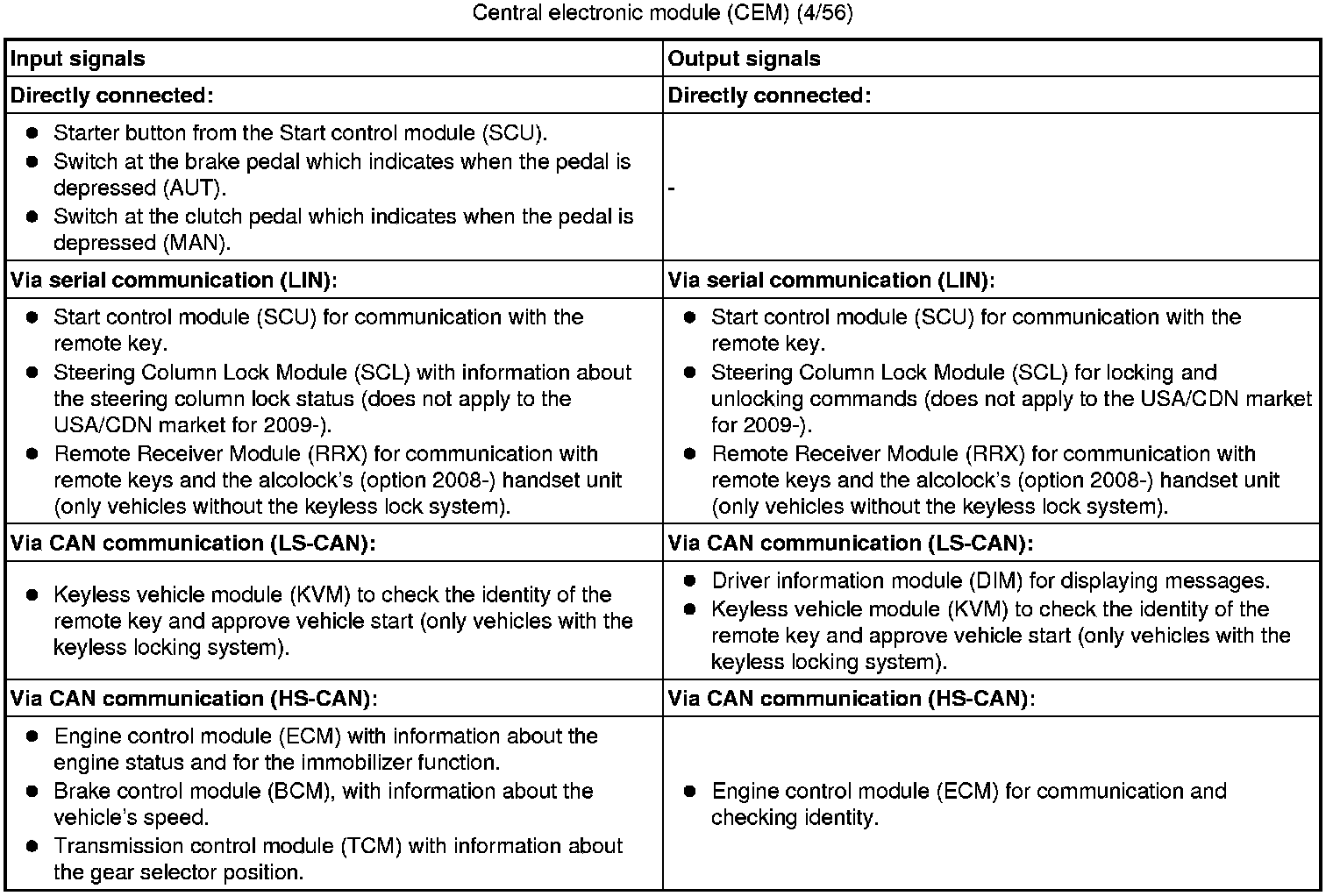 The tables below summarize the input and output signals to the units in the system for the immobilizer. The signal types are divided into directly connected signals, serial communication and controller area network (CAN) communication.