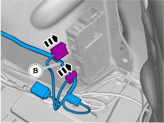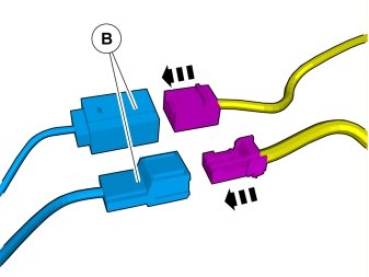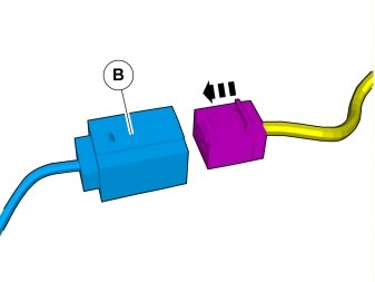- Locate the 5-pin green connector that is taped onto the parking assistance cable harness. Connect this to the adapter wiring (B).
