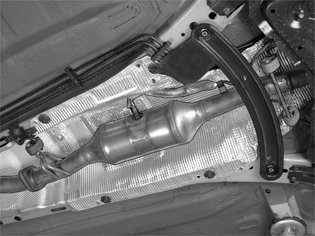 Raise the vehicle. Disconnect the heated oxygen sensor (HO2S) cable harness above the sub-frame. Disconnect the cable harness from the SIPS member.