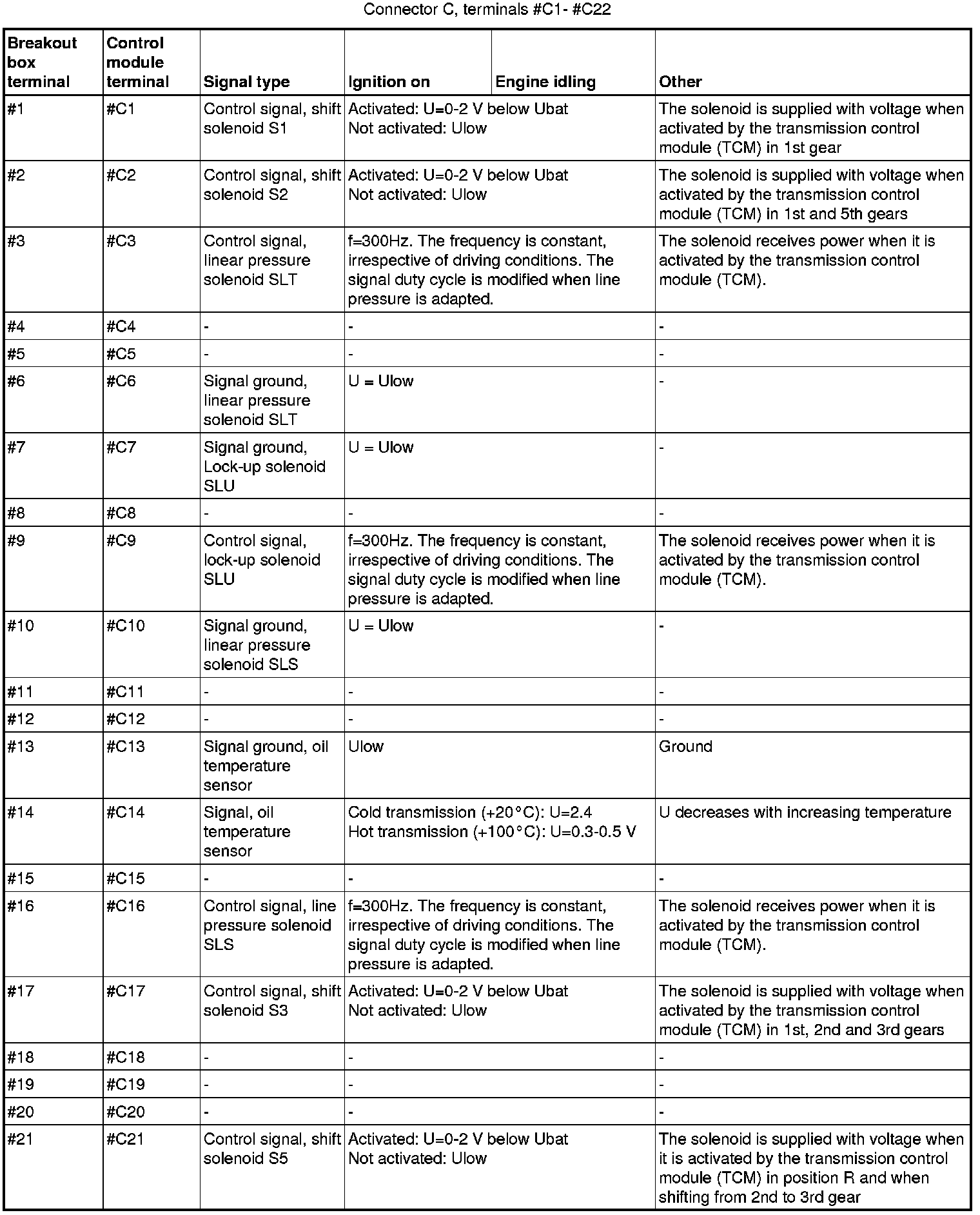 - Connector C (22-pin on transmission side) corresponds to terminals #1 - #22 on the breakout box.