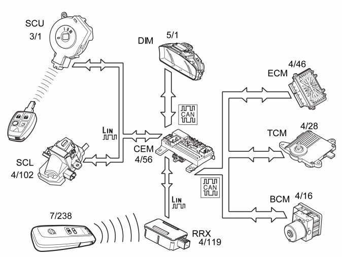 When the key is inserted in the ignition switch, the key blade acts on the key-in switch. The key-in switch then forwards 12V from the battery to the central electronic module (CEM) and to the communication circuit in the start control module (SCU). The central electronic module (CEM) then activates the fuel pump (FP). When the signal is received by the central electronic module (CEM), it sends this command to the start control module (SCU) instructing it to check the key. The start control module (SCU) activates the antenna ring and reads off an identification code from the key transponder. This code is transmitted to the central electronic module (CEM) and compared with the codes programmed in the central electronic module (CEM).