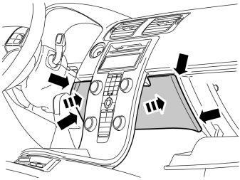 - Carefully pry off the panel inside the centre console. Use a plastic weatherstrip tool. The panel is secured by two clips on each of the short sides.