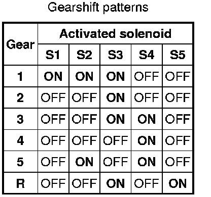 The solenoids are activated in a specific pattern to control shifting and the lock-up function. Solenoids S1-S5 determine which gear is to be used. Solenoids SLS, SLU and SLT determine engagement by adjusting the hydraulic line pressure. The basic parameters for the different shifting points are the accelerator pedal (AP) position and the vehicle speed. The shift quality is decided by controlling the torque.