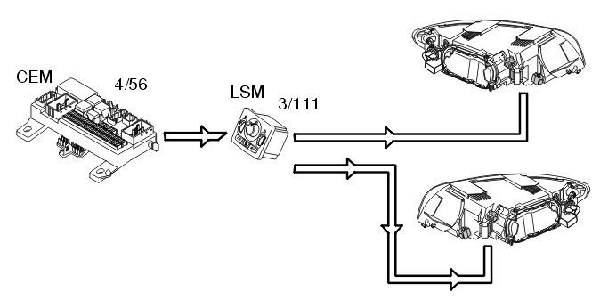 The central electronic module (CEM) (4/56) receives information from the light switch module (LSM) which is directly connected to activate the lamps.