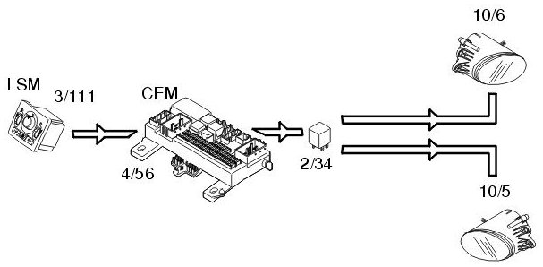 The front fog lamps (10/5-6) are activated by pressing the button for the front fog lamps in the light switch module (LSM) (3/111). The light switch module (LSM) is directly connected to the central electronic module (CEM) (4/56).