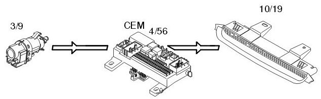 The central electronic module (CEM) also transmits a CAN signal to the driver information module (DIM) (5/1) to light the indicator lamp for high beam.