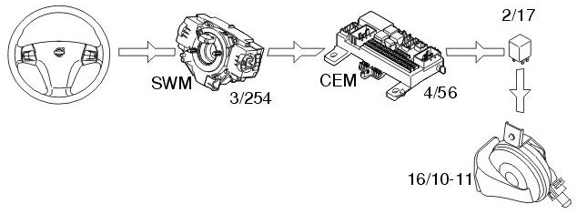 The horn (16/10-11) is operated when the steering wheel module (SWM) (3/254) receives a signal from the switches in the steering wheel. The steering wheel module (SWM) transmits information via a directly connected cable to the central electronic module (CEM)(4/56) indicating that the switch is closed. The central electronic module (CEM) activates the relay (2/17) for power supply to the horn.