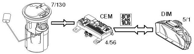 The fuel level is gauged by the fuel level sensor (7/130). The signal from the sensor is transmitted to the central electronic module (CEM) (4/56). The central electronic module (CEM) calculates the remaining quantity of fuel by comparing the signals with a tank table. Information about the quantity of fuel is transmitted via the Control area network (CAN) to the driver information module (DIM) (5/1)where the fuel level is displayed on the fuel gauge.