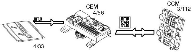 In the event of a fault, the central electronic module (CEM) transmits data via the Control area network (CAN) to the driver information module (DIM) (5/1) which displays a text message.