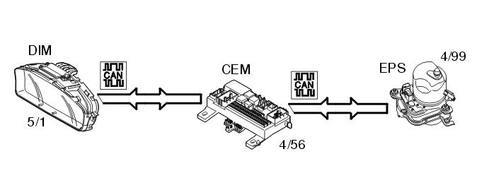 The central electronic module (CEM) (4/56) transmits information about permitted power level to the electrical power steering module (EPS) (4/99) via the control area network (CAN). The information is also transmitted to the driver information module (DIM) (5/1), via the controller area network (CAN), which lights the general warning lamp. The driver information module (DIM) also displays a text message.