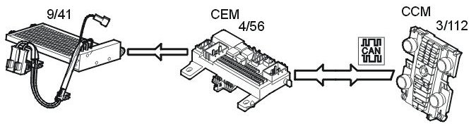 The central electronic module (CEM) (4/56) receives information via the CAN network from the climate control module (CCM).