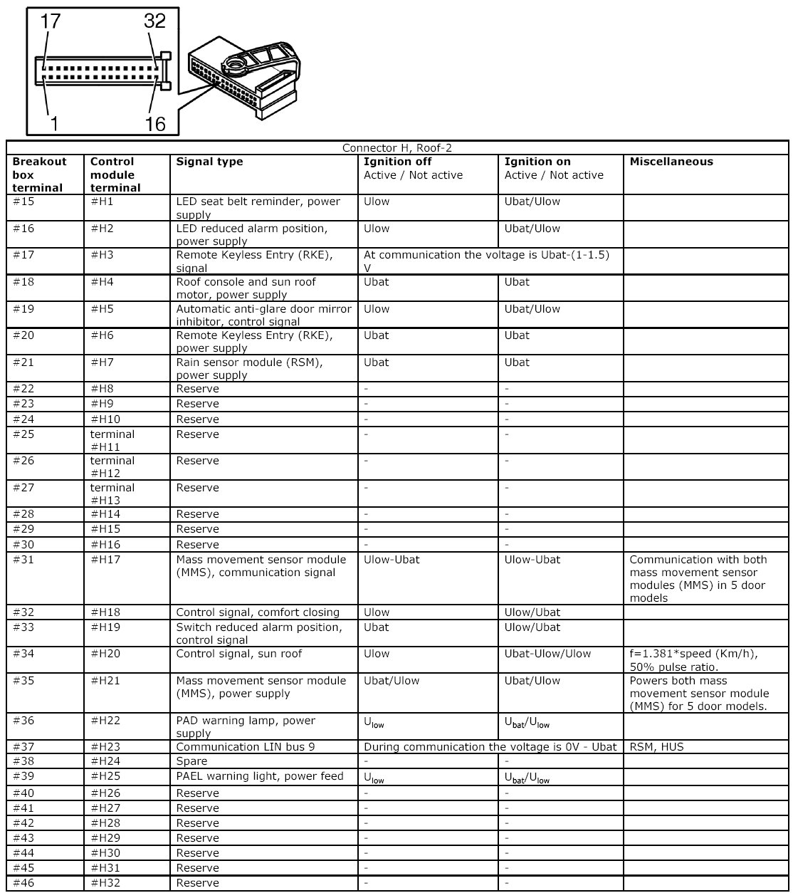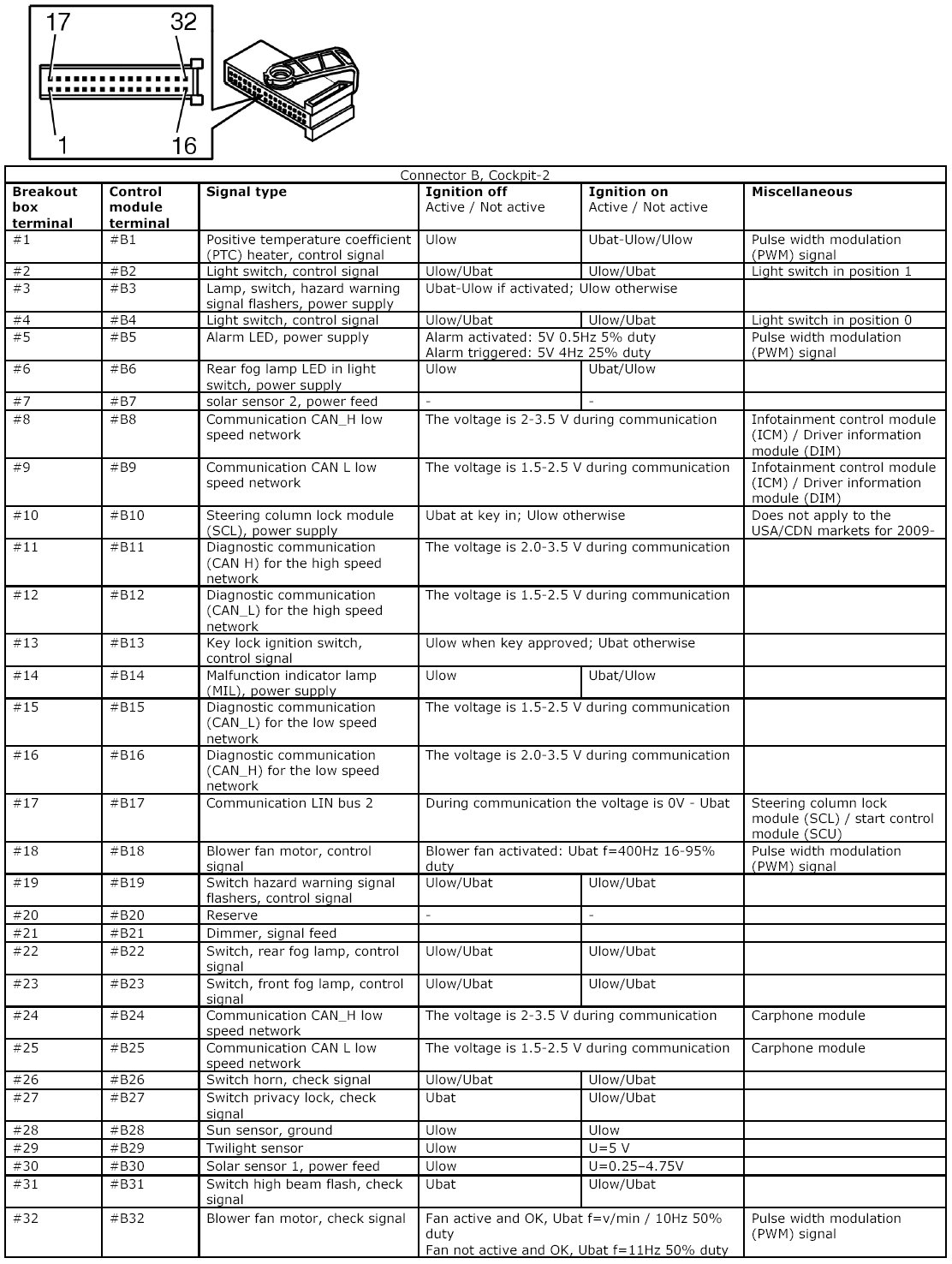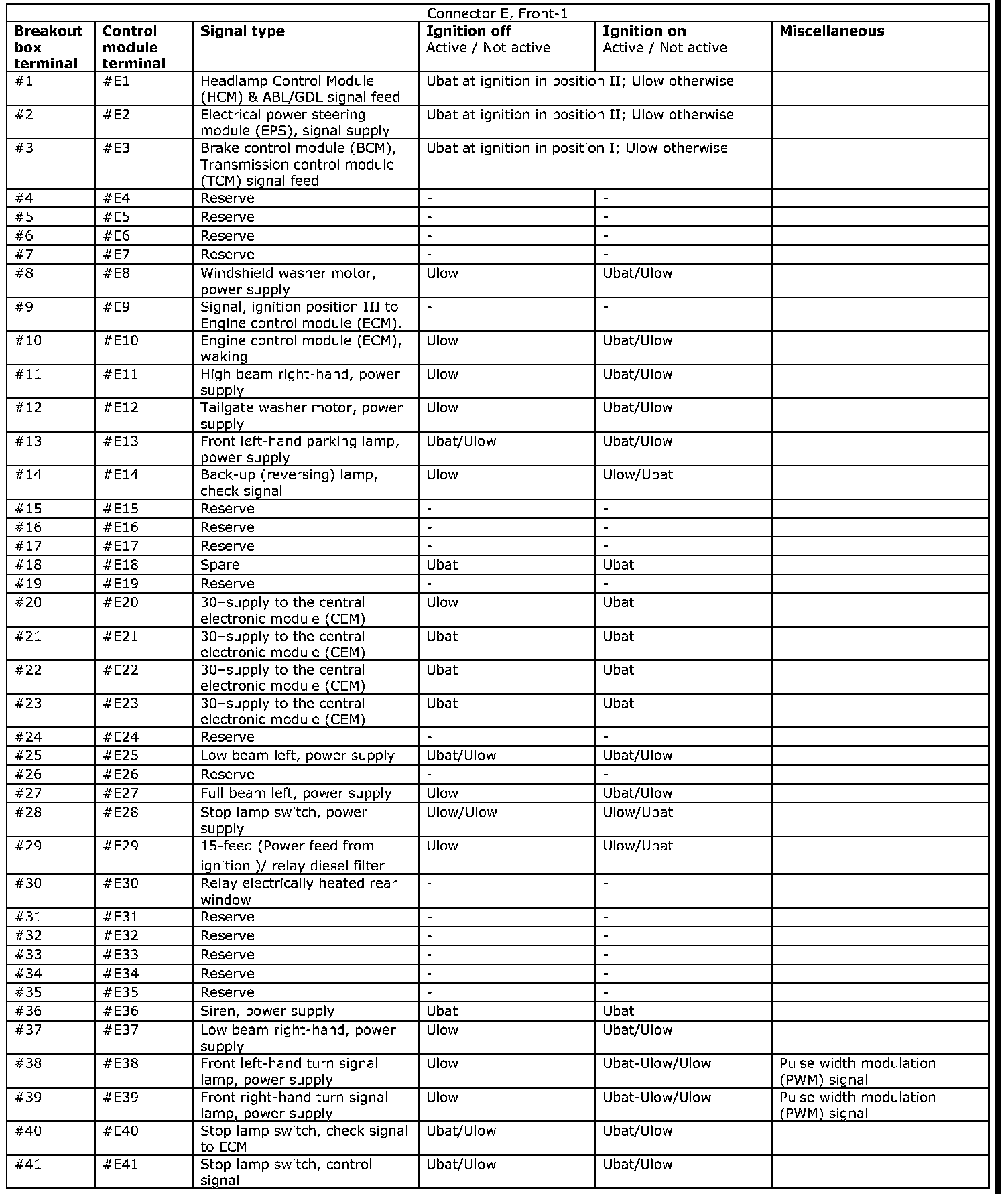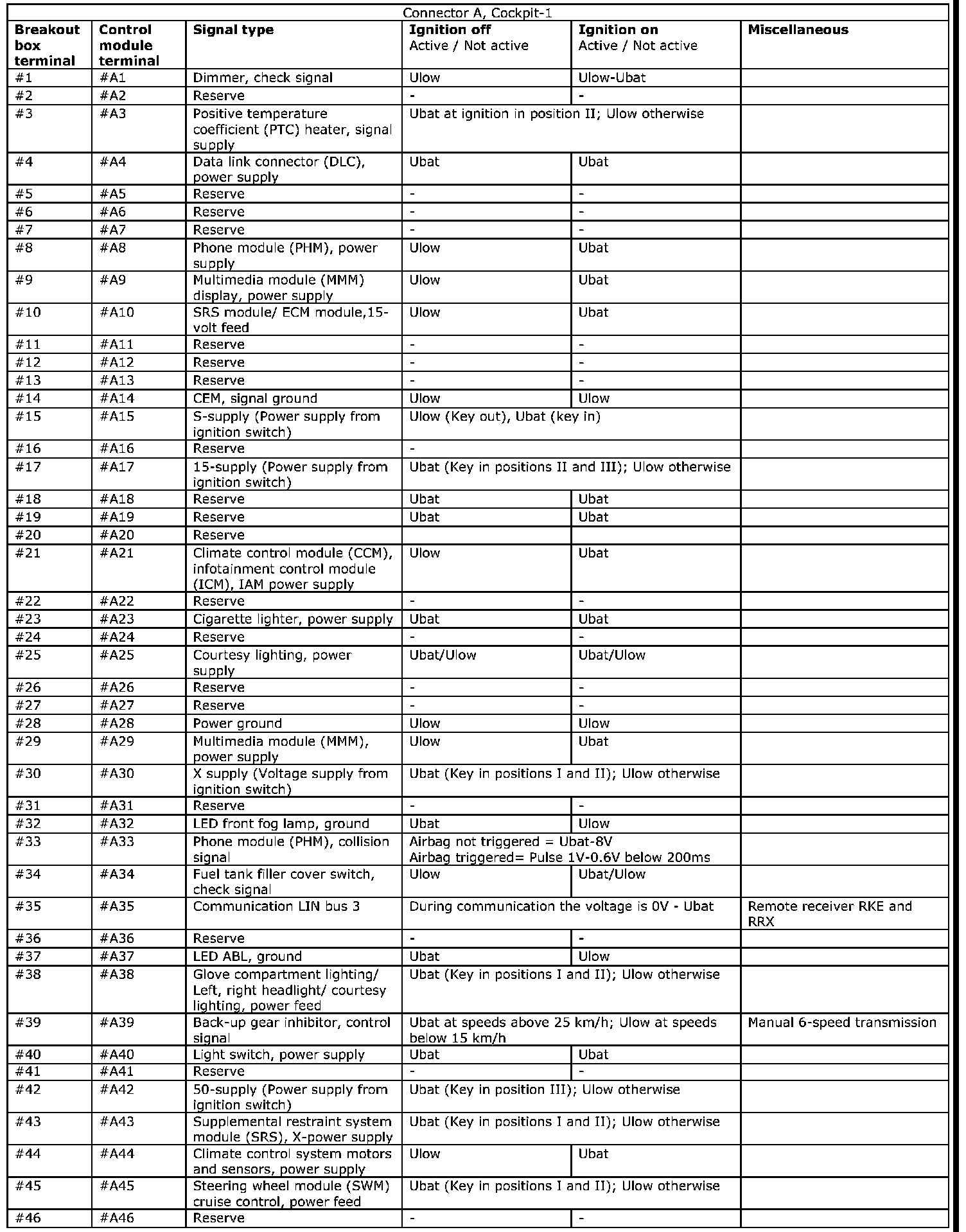 All the values given below are between the connections in column 1 and connection #A28 in column 2 (power ground). This applies unless otherwise indicated in the last column.