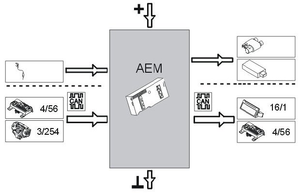 The function of the accessory electronic module (AEM) is to allow certain accessories to exchange information with the controller area network (CAN) of the vehicle. The control module functions as an interface between accessories, which are not prepared for Controller area network (CAN) communication, and the Control area network (CAN) of the vehicle and its functions. This exchange of information means that accessories can be installed with greater functionality and higher quality.