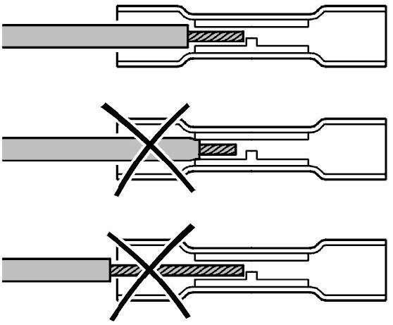 Insert the cable as far into the crimping sleeve as it will go. Ensure that the cable insulation does not get into the crimping area and that the stripped cable does not protrude from the sleeve.