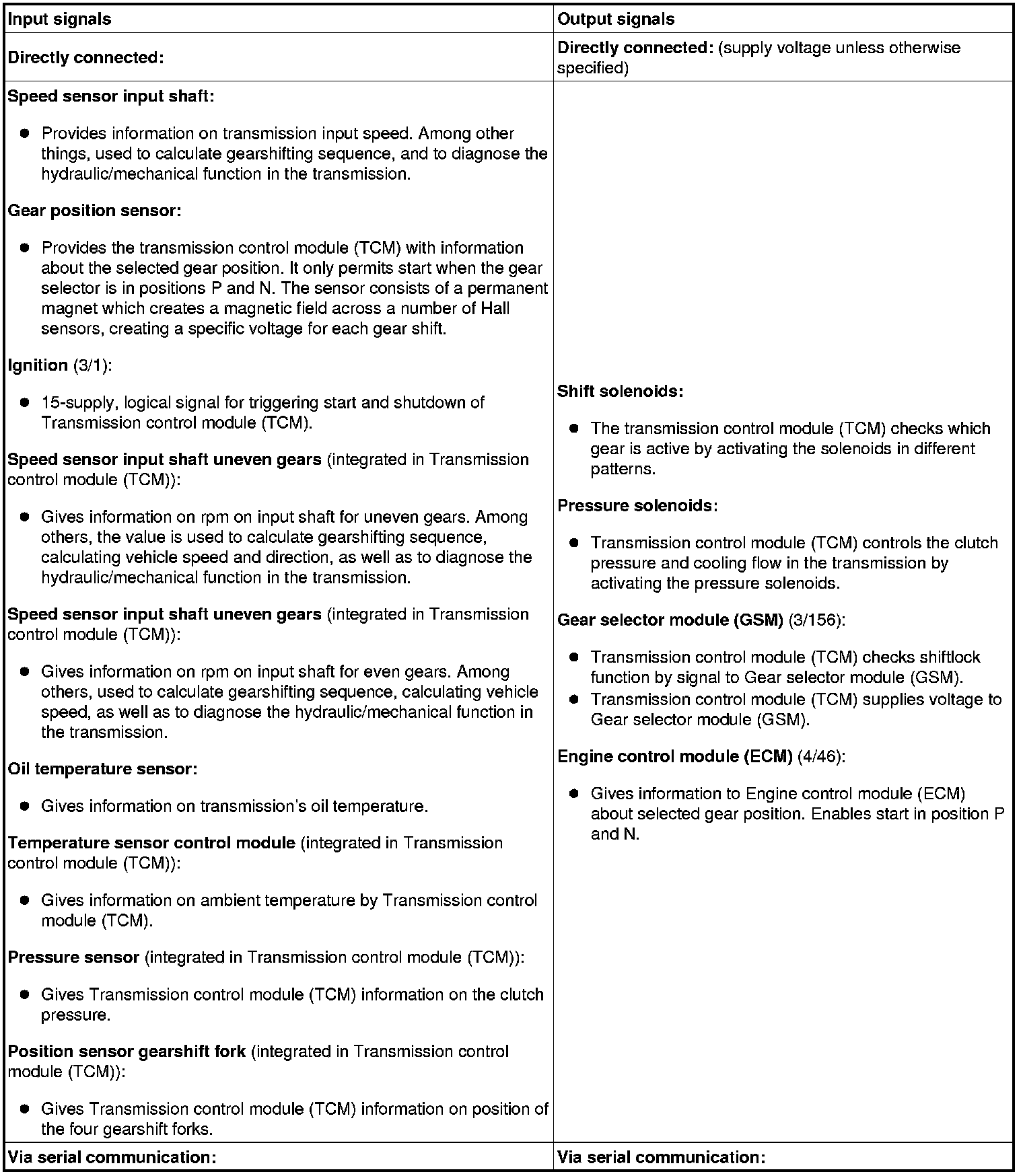 The table below summarizes the input and output signals to and from the transmission control module (TCM). The signal types are divided into directly connected signals, serial communication and CAN communication. The illustration below displays the same information with Volvo component designations.