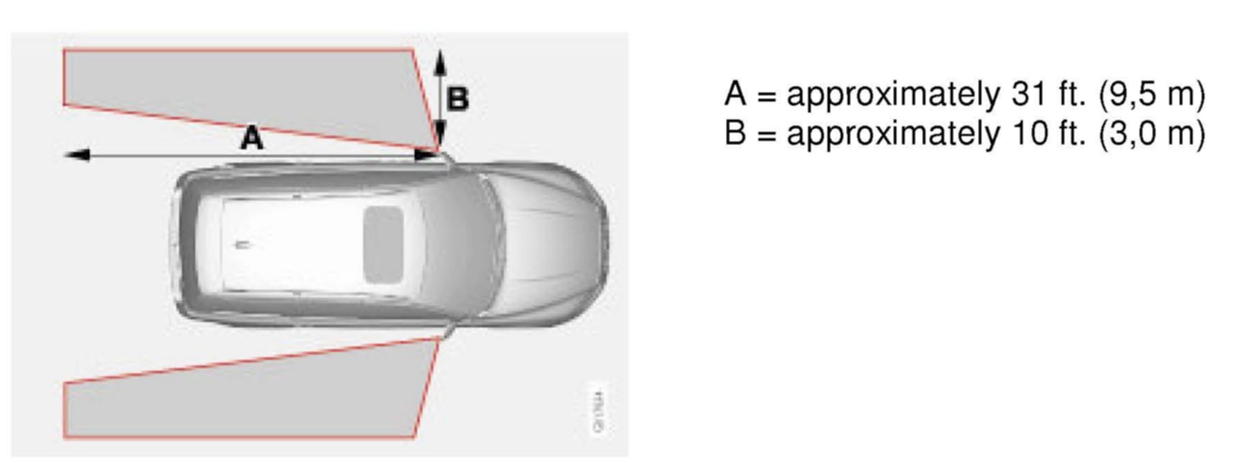 The picture below shows the critical area that may not be seen in the outer rear view mirrors which also is the area where BLIS, is designed to at minimum, detect other vehicles.