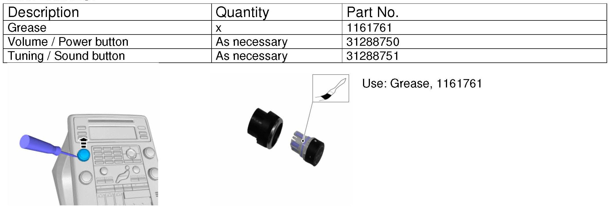 The radio "VOLUME/POWER" and "TUNING/SOUND" button is now available as spare parts with separate part numbers. It is no longer necessary to replace the entire CCM (Climate Control Module) if there is a defect with the volume or tuning button.