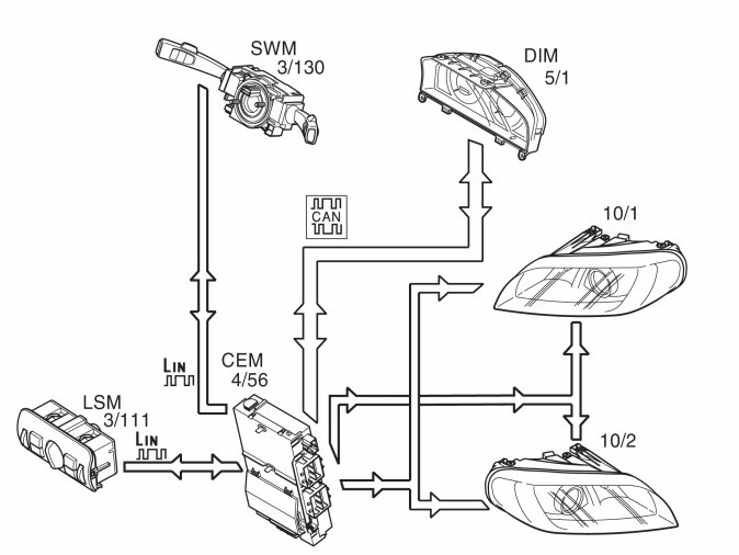 Depending on the position of the knob in the light switch module (LSM) (3/111), the module transmits a request to the central electronic module (CEM) to switch on low beam. Central electronic module (CEM) (4/56) supplies power to the low beam directly via an output.