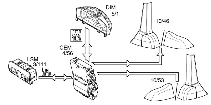 The rear fog lights (10/46 and 10/53) are activated by pressing the rear fog light button in the light switch module (LSM) (3/111). The central electronic module (CEM) (4/56) receives a request to activate the rear fog light from the light switch module (LSM) via LIN communication. The central electronic module (CEM) powers the lights directly via an output.