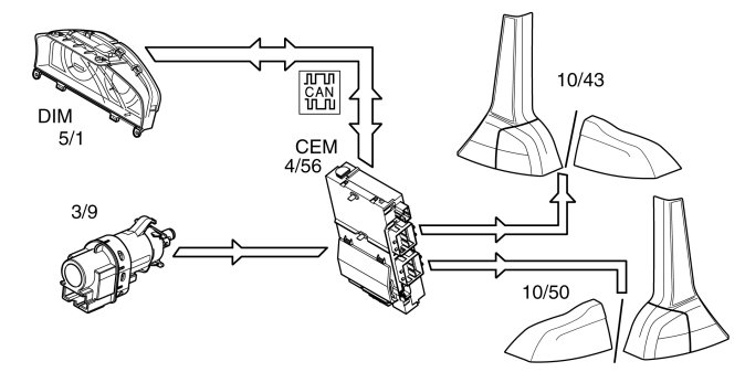 In the event of a fault, the central electronic module (CEM) transmits data via the Control area network (CAN) to the driver information module (DIM) (5/1) which displays a text message.