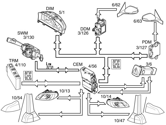 This function is controlled by the left control stalk. The steering wheel module (SWM) (3/130) sends signals to the central electronic module (CEM) (4/56) via LIN communication to activate the turn signals (10/13-14 and 10/47-54).