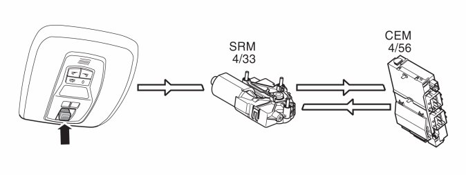The sunroof is equipped with a sunroof module (SRM) (4/33) that handles its functions. The sunroof is operated via a switch on the roof panel.