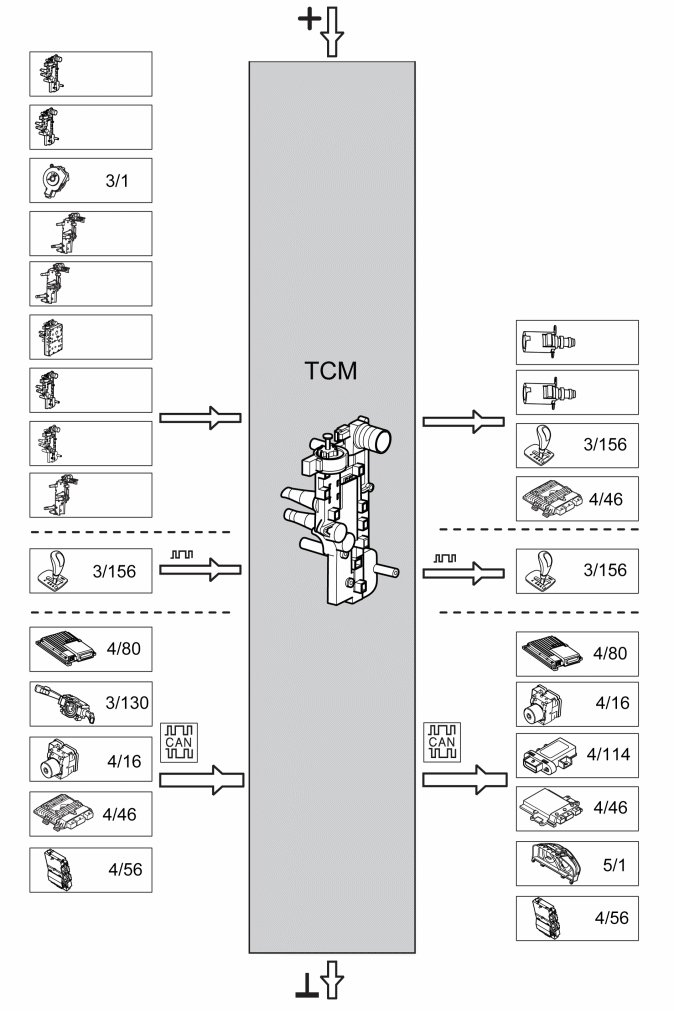 The table below summarizes the input and output signals to and from the transmission control module (TCM). The signal types are divided into directly connected signals, serial communication and CAN communication. The illustration below displays the same information with Volvo component designations.