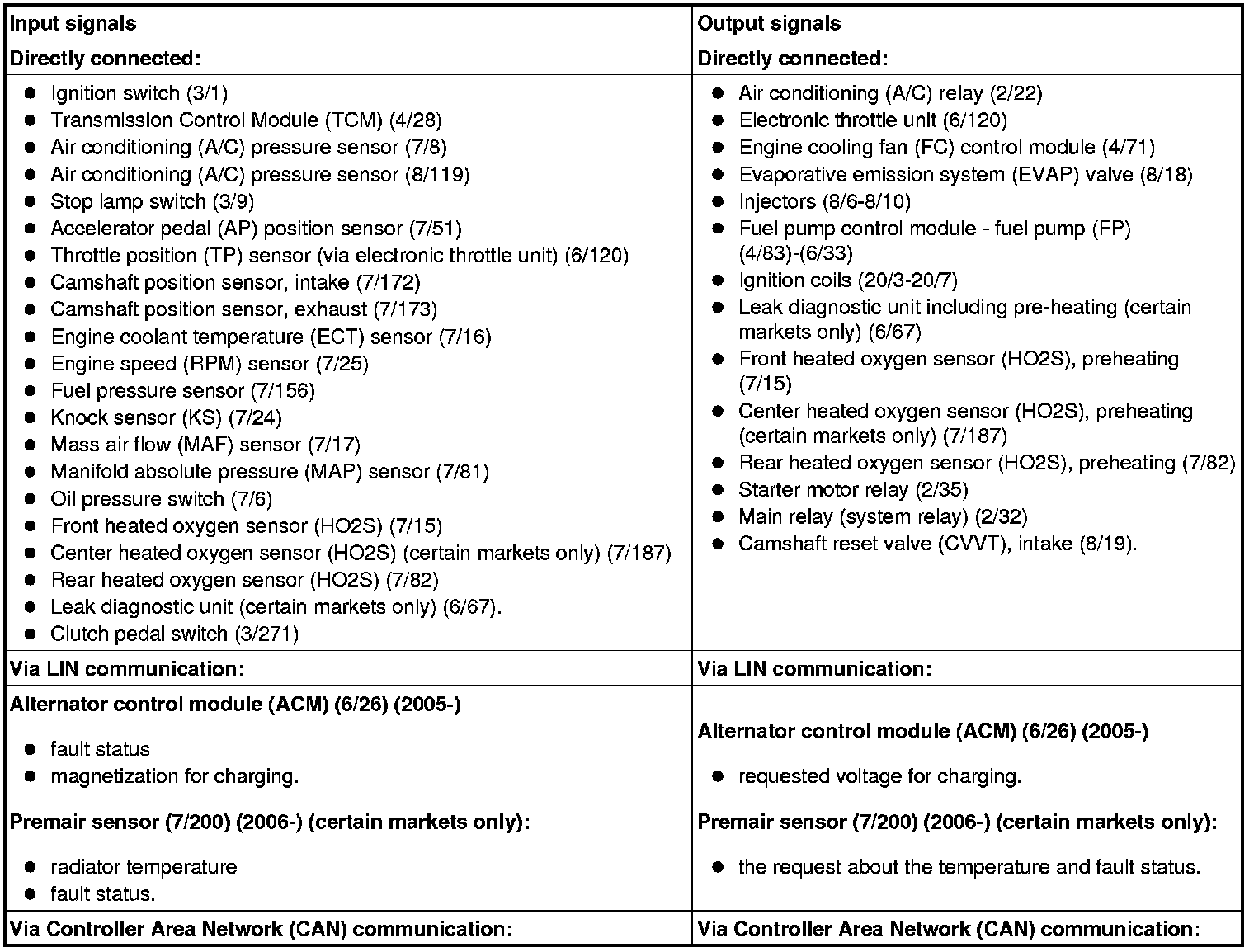 The table below summarizes the input signals to and output signals from the Engine Control Module (ECM). The signal types are divided into directly connected signals, serial communication and controller area network (CAN) communication. The illustration below displays the same information with the Volvo component designations.