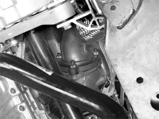 Remove the screw for the heat deflector plate over the turbocharger (TC). Slacken off the screw behind the intake hose a few turns.