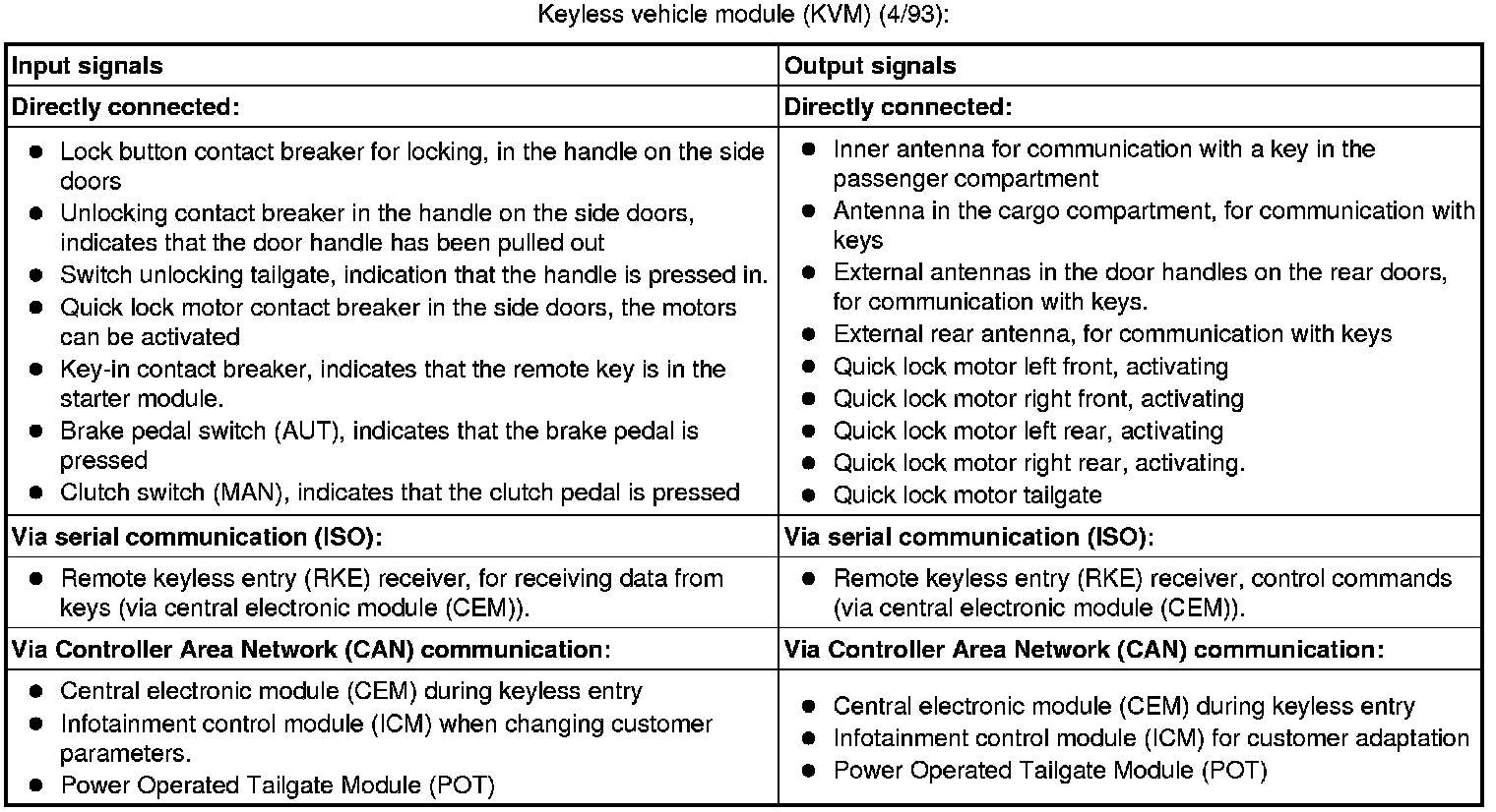 The tables below summarize the input and output signals to the units in the central locking system. The signal types are divided into directly connected signals, serial communication and controller area network (CAN) communication.